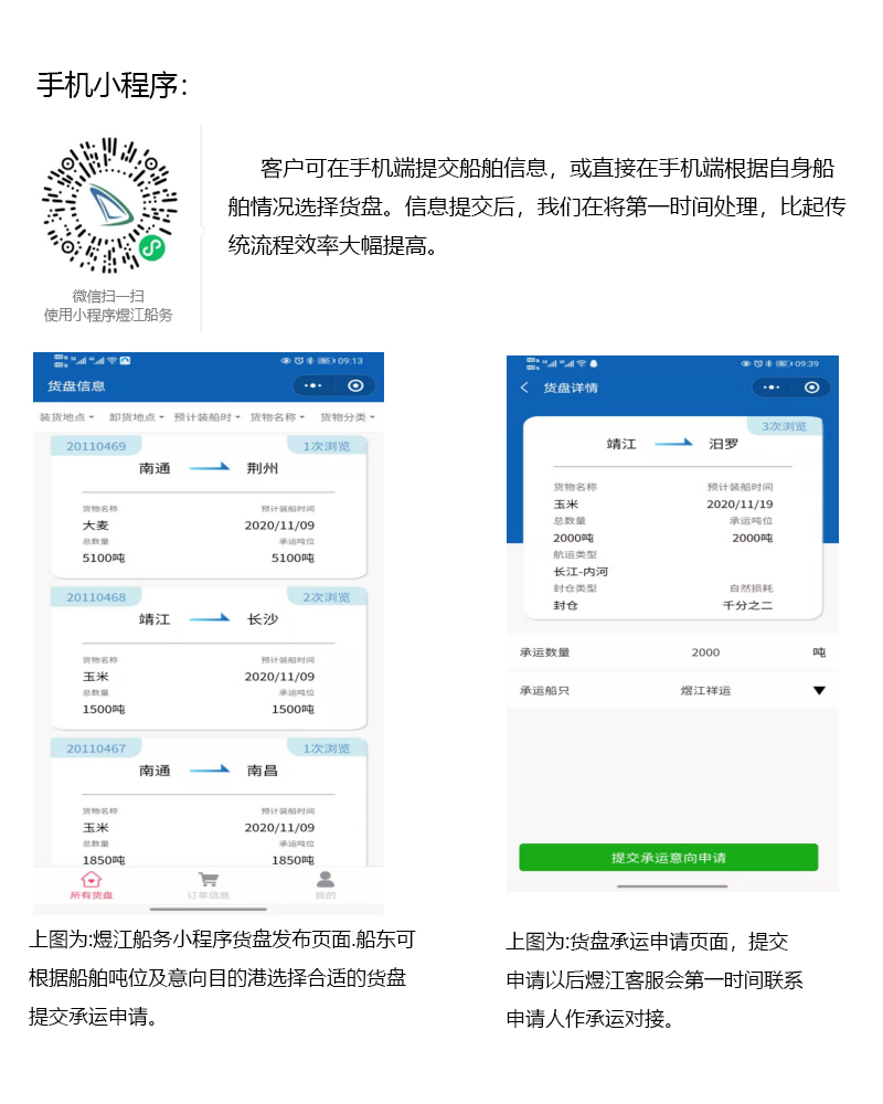 为更好的为广大客户提供优质高效服务,煜江船务围绕客户运营、流程运营、管理运营等三大板块,自主研发并成功上线了在线订舱平台(网页版)以及“煜江船务”手机小程序。